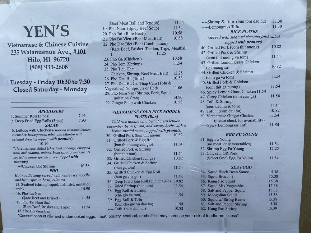 Introducing Yen's Cafe, a delightful fusion of Chinese and Vietnamese cuisine located at 235 Waianuenue Ave, Hilo, HI. As an Asian-owned establishment, Yen's Cafe offers a cozy atmosphere that is perfect for families and groups, complemented by outdoor seating options.